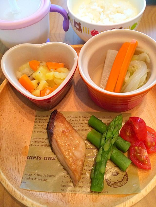 山りょ 飯テロ 次女チャン1歳1ヶ月の今日の夜ご飯 焼きカレイ茹で野菜とbf鶏レバーと緑黄色野菜 ハムと大根のサラダ きゅうりスティック鰹節かけ 納豆ご飯アオサかけ 後でフォロミ0ml飲むよ 離乳食 完了期